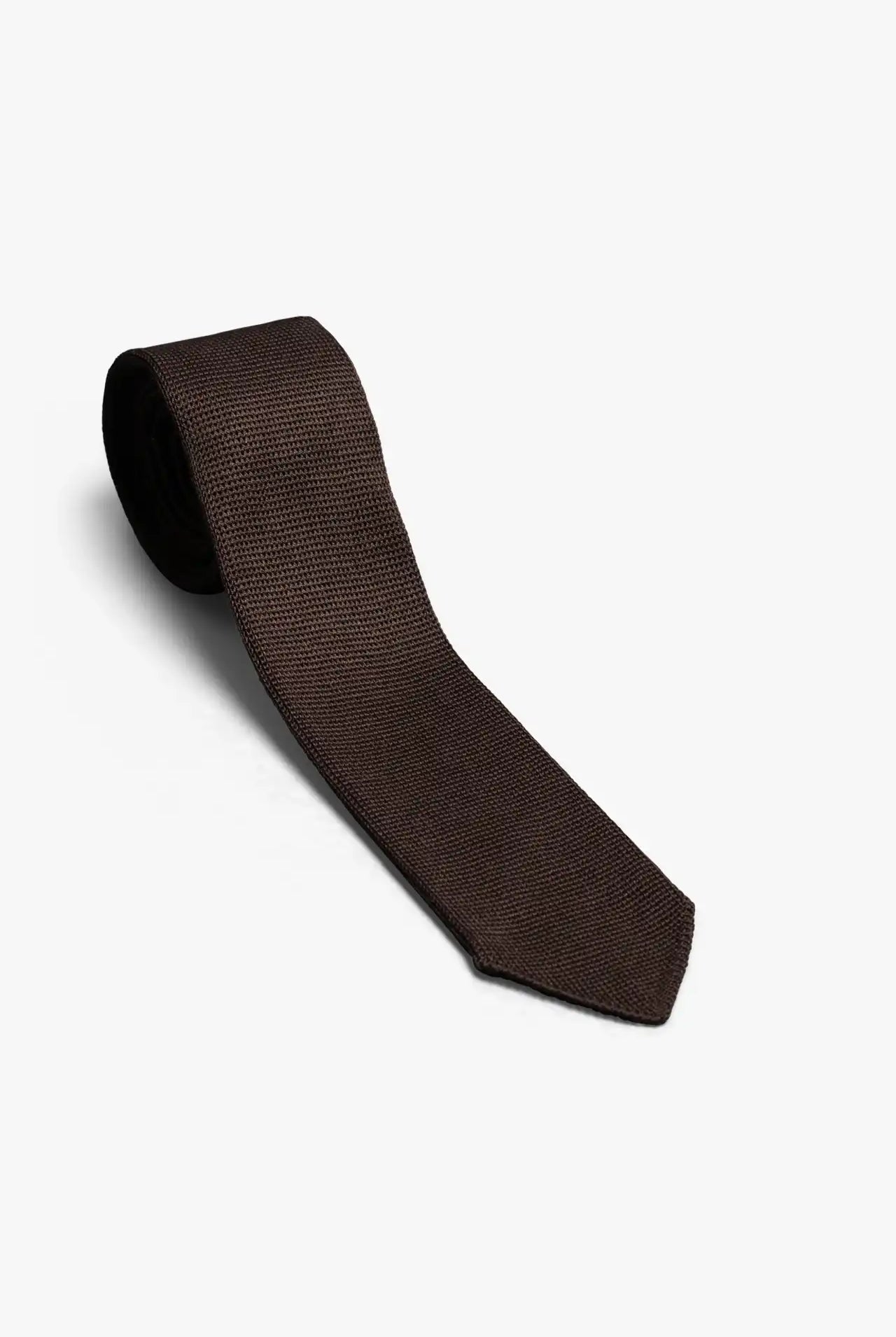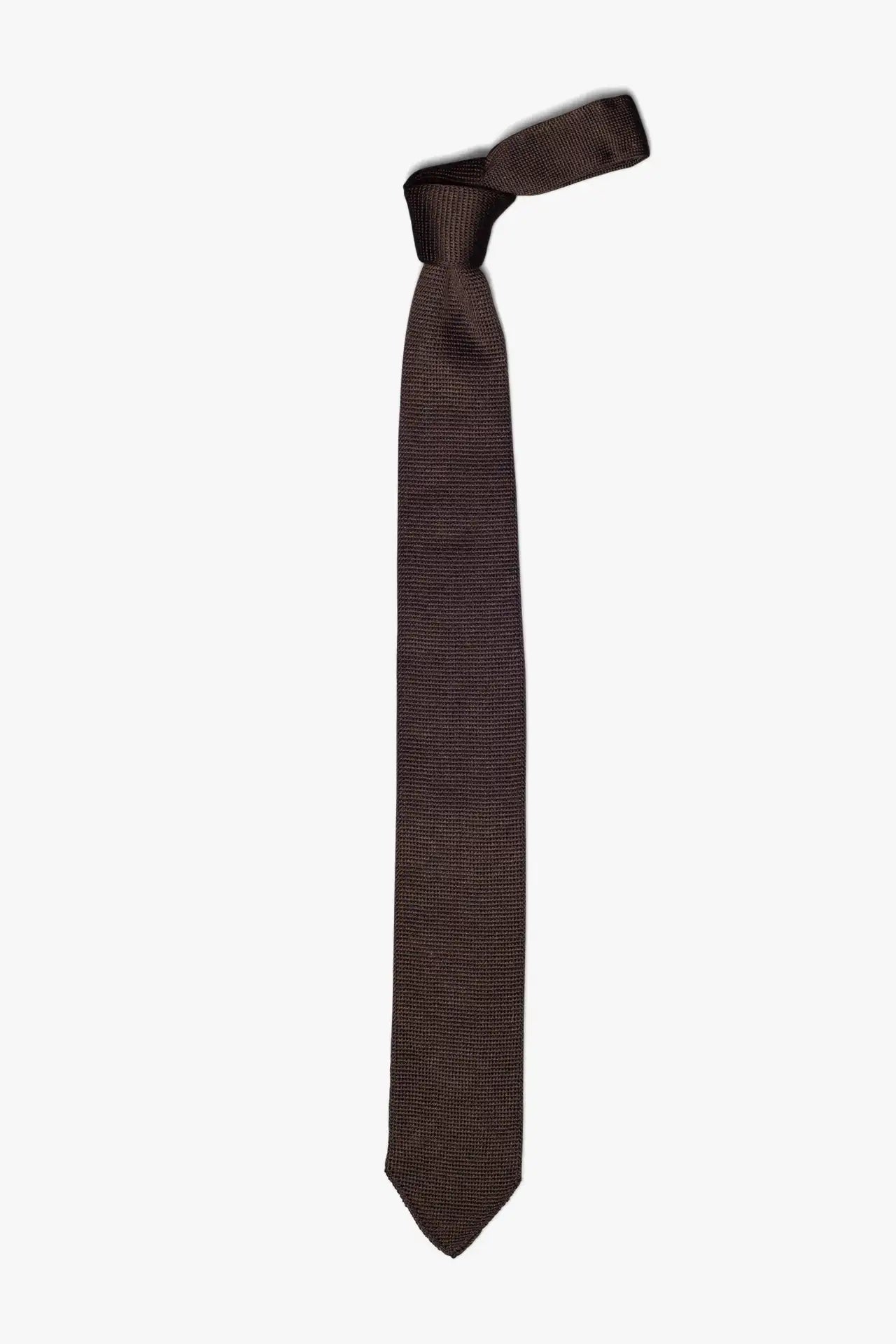 This Brown silk tie is a contemporary take on a classic knit tie, featuring a complex knitted structure, a slim design, and a sharp pointed tip. A versatile tie that pairs effortlessly with both a weekend flannel and a Monday-through-Friday suit.